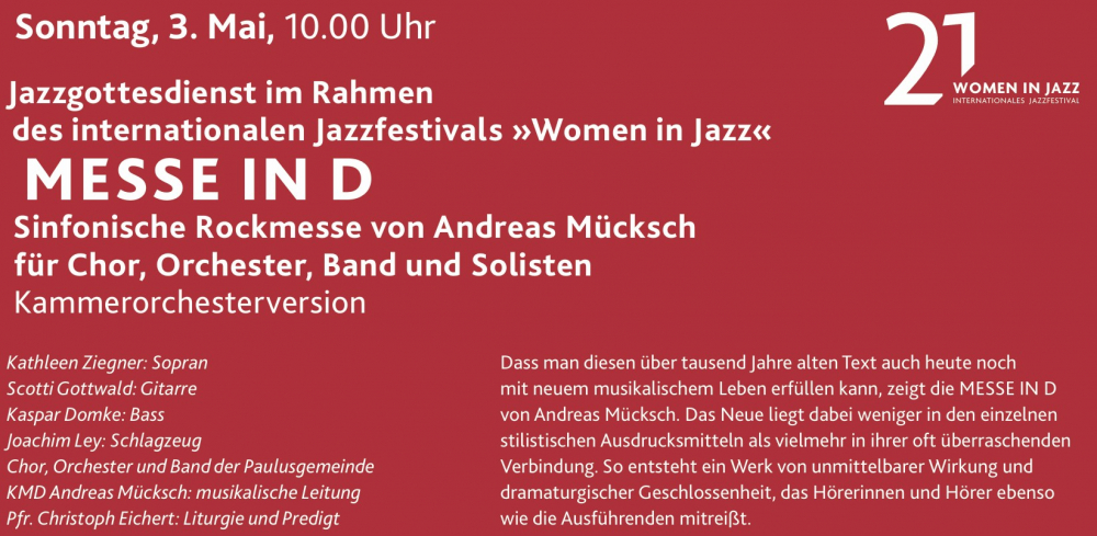 - Sonntag, 3. Mai, 10.00 Uhr Jazzgottesdienst im Rahmen des internationalen Jazzfestivals »Women in Jazz« "MESSE IN D" Sinfonische Rockmesse von Andreas Mücksch für Chor, Orchester, Band und Solisten Kammerorchesterversion