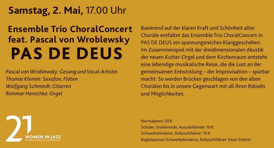 - Samstag, 2. Mai, 17.00 Uhr Ensemble Trio ChoralConcert feat. Pascal von Wroblewsky "PAS DE DEUS"
